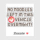 Funny sticker reading No noodles left in this vehicle overnight! There's even a little box of noodles with chopsticks. Ideal for chefs and food delivery staff.
