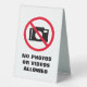 No photos or videos allowed camera prohibited warning Table Tent Sign . Handy modern stop icon for museum, private property, library, shop, store, quiet no talking area, room, park, school exams, office, wedding, party, business, company, hospital, university, care home, zoo, shop, store, public space etc. Camera forbidden to use notice. Stop taking pictures (with flash). Reversible display.