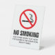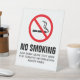 No smoking table top sign with a crossed over cigarette and the text "No smoking" with  three lines of custom text below.