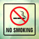 No smoking window cling sign featuring a black cigarette with smoke coming out and a red, crossed over circle around it. Text below: No smoking