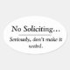 No Soliciting sticker, 4 pack. Use one and save the rest or give as gifts. No Soliciting...Seriously don't make it weird. This is a great humourous way to keep the solicitors away.