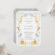 Adorable jungle animals, with sweet vines and leaves surround this adorable Christening invitation. Blue elephants bookend a cross at the top of the invite with giraffes, monkeys, zebras, and lions rounding it out. Your text is in the middle of it all to announce your little one's big day.