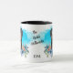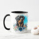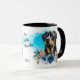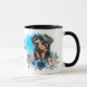 The feature on this mug is a beautiful watercolor image of a black and tan Rottweiler emerging out of a bouquet of blue and peach roses. The image is placed on a bright blue splatter background and printed twice on the mug. Between the two images is your custom text and your monogram or name in black. Make it say whatever you'd like, or even remove the text completely if you'd like.