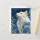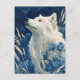 This ethereal postcard features a majestic white wolf in profile, gazing toward a star-studded midnight sky. The artwork is characterized by intricate, flowing linework within the wolf's fur, set against a deep indigo background with a cracked marble texture. Vibrant blue blossoms and tall, golden wheat-like stalks frame the wolf, creating a serene and mystical atmosphere. The rich palette of navy, cerulean, and cream provides a sophisticated, artistic vibe. As a postcard, it is perfect for sending a soulful message or as a unique piece of miniature wall art for nature and wildlife enthusiasts.