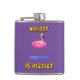 The flask itself is fine. It’s a cheap flask, obviously bought in bulk, however am prepared to overlook that. Given that it is a personalized item, I would have liked to have seen gift boxing instead of the generic packaging. Terrible printing, and/or quality. It’s a cheap, tacky vinyl. It is not cut straight and is also applied in a way that it is overhanging the bottom, causing the glue to catch on items and it will eventually roll and tear, damaging the wrap.