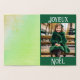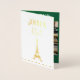 A cheerful green and golden Noel card featuring four distinct design sections! One is a full-colour printing within the card.A small vintage lady is dressed with a cap and green fur coat. Satisfied on a seat in Paris. In the distance is the Eiffel Tower! Joyeux Noël is the French for "Merry Christmas". 2. Inside the card, there is a background that looks like green parchment. You can add a photo or messages. 3. Outside front: the Eiffel tower and the French Christmas greeting Joyeux Noel are printed in golden foil on a white backdrop. 4. Outside back: the Eiffel tower is printed in golden foil on a white background!
