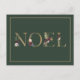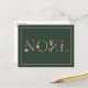 An elegant Christmas holiday greeting post card with beautiful text spelling out NOEL and embellished with watercolor floral accents in burgundy, blue and pale pink. A gold border outlines the outer edge of the card with a rich deep hunter green background. A return address template is included on the reverse side of the post card for you to personalise with your address.