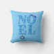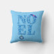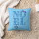 Throw pillow in the greeting "Noel" patterned with retro modern Christmas trees in shades of ice blue, embellished with a holly sprig and a snowflake ornament