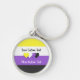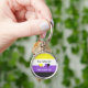 Premium keychain with the non-binary pride flag with little hearts in the centre of the design. Black, purple, white, and yellow flag of the enby pride movement; with an editable text field for your name or message