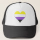 Black Trucker Hat with a heart design in colors of the non-binary pride flag; a yellow, white, purple, and black design