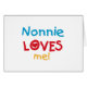 Nonnie Loves Me T-shirts, cards, stickers, bodysuits bags, and more with colourful red, yellow, and blue text and heart design. These Nonnie Loves me apparel and gift items will make nonnie smile!