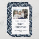 Magical blue photo Merry Christmas card featuring enchanted forest with a fox, folk botanicals and Nordic ornaments. Easily personalise this blue photo holiday card with your photo and family name.