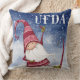 Get in the holiday spirit with this cute watercolor gnome pillow featuring a red and white Nordic gnome trying to balance on his skis. There is white text that says Ufda." The back has a red and white fair isle pattern.