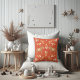 A folk-art throw pillow adorned with a Nordic floral motif with gold leaves, featuring horses and saddles, set against a vibrant red-orange backdrop.