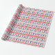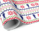The repeated pattern on this colorful Christmas Nordic sweater style gift wrapping paper is a silhouette baseball player leaning on his bat among snowflakes , trees, and geometric designs. Colors include navy blue, bright Holiday green, and red, all on a white background. Fun for anyone who loves baseball!