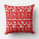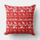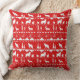 A red and white throw pillow featuring a Nordic sweater pattern of white winter animals.