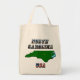 The bag is well made and very strong. Holds a good amount of groceries. I get asked about it all the time. The printing is great and very clear.