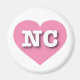 This magnet features a vibrant pink heart containing the bold, white, upper case letters NC, the official abbreviation for North Carolina, the tar heel state.
