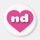 This magnet features a vibrant hot pink heart containing the bold, white, rounded lower case letters nd, a playful abbreviation for the state of North Dakota, the peace garden state.