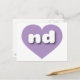 This postcard features a lavender heart containing the bold, white, rounded lower case letters nd, a playful abbreviation for North Dakota, the peace garden state. The reverse side of the card is blank, awaiting your handwritten sentiments or personalised text.