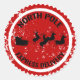 This round sticker features the North Pole Express Delivery with Santa and his reindeer. It can be used for decoration on anything, such as a wall, car, window, or a present. Design features red black and white colours with a distressed look.