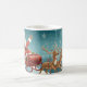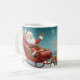 Santa Claus and his reindeer soaring over a peaceful, snow-covered winter village.