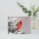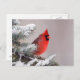 Male northern cardinal sitting in an evergreen tree following a winter snowstorm