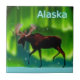 An ever so slightly stylised image of a moose silhouetted against the Northern Lights. Text reading "Alaska" appears in glowing blue and white.