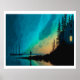 Northern Lights, sloop by the sea in a northern forest. Aurora Borealis, Canada, Scandinavia, Norway, Sweden, Finland, Alaska, Minnesota, Wisconsin, Michigan, Maine, Adirondacks, Great Lakes, house with a light on, man standing by the shore. Generative art inspired by Scandinavian and North American landscapes.