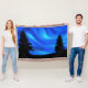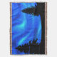 This digital artwork features a display of swirly blue lights in the night sky above the silhouettes of two evergreens.