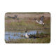 A small pond with northern pintail ducks. Two have taken flight and a third stands in shallow water.