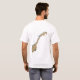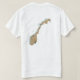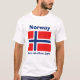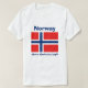 An editable title and slogan accompanies the white fimbriated offset blue cross on a red background of the Norwegian flag on the front of this t-shirt. The back displays a detailed map of Norway.