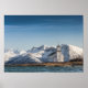 A landscape photograph with the white wooden church of Gimsøy and snow covered mountains in the background. On the Lofoten Islands at the coast of North Norway, Scandinavia. Photo: Sebastian Worm.
