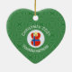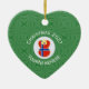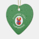 Blonde haired angel wearing the flag of Norway on a heart shaped ceramic ornament for holiday and Christmas decor. The Norwegian flag Christmas angel is found inside a white circle of squiggly squares, surrounded by a background of green squiggly squares. Add your own text or personalise with a name and customise with the year.
