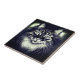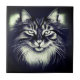Ceramic tile in a closeup portrait of a Norwegian Forest cat with detailed, grayscale shading, showcasing its intricate fur patterns. The use of black and white contrasts sharply to highlight the feline's face.