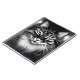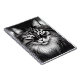 Notebook in a closeup portrait of a Norwegian Forest cat with detailed, grayscale shading, showcasing its intricate fur patterns. The use of black and white contrasts sharply to highlight the feline's face.