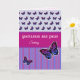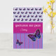 A modern card design which you can customise with your own text and the name of the recipient. The colour scheme is pink, lilac and blue, and there are coordinating butterflies and stripes patterns on the front. Type in the boxes to change the greeting on the front "Gratulerer med dagen" (Happy Birthday) and the name. And change the message inside, or use the provided "Ønsker deg til lykke med fødselsdagen." Inside, there is a delicate pattern of scattered hearts on a pale pink background, and an extra butterfly.