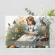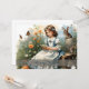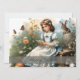 A young girl in a blue dress with white ruffles sits on a wooden bench in the middle of a flowering garden. She is reading a small card while butterflies fly around her. A hare and a small rabbit sit next to her, while other spring flowers bloom in warm colours in the background. The words "Happy Easter" give the picture a festive touch.