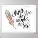 "Not all those who wander are lost." Lovely cursive quote in black typography set against a classic white background and accented with a stylised feather in earthy tones of brown, grey, green and peach.