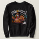Vibrant cartoon turkey in a pilgrim hat, mid-sprint with a cheeky pose. Bold colors, playful lines, great for Thanksgiving themed and fun gift items.