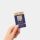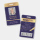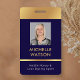 Modern Photo ID badge in navy blue and gold with space for a custom profile photo, job title, contact details, services and barcode. This elegant employee name badge features dark blue background and faux gold effects with fully editable text and a photo.