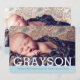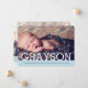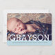 Thoroughly modern and simply elegant, this design is a perfect way to introduce your sweet little boy. Features his first name in bold white typography with so baby blue accent. Two large photos of your baby - one on the front and one on the back. The front also holds baby's birth information, and on the back a special text area to be personalised with parents and family info. A lovely modern introduction of your baby boy to family and friends.
