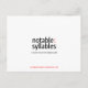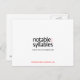 Test run accomplished: this is a quality postcard! Heavy cardstock, excellent printing, glossy front finish, and an easy-to-write-on back. Everything one could ask for in a postcard, in my opinion. The print is clear, rich, and perfectly in focus--well-complimented by the glossy finish. I'm thrilled by the professional quality and will be using Zazzle again for future notable syllables pieces.