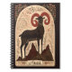 This zodiac notebook showcases a fierce black ram with red spiral horns, set among swirling celestial lines and jagged peaks – capturing the bold essence of Aries.