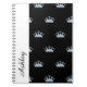 Notebook shown with a art print of a Silver Blue coloured crown on a black background and a custom name. Notebook shown in a Black and White design. Customise this item and change the name to yours or take off the name and buy as is.