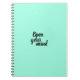Minimalistic notepad with an inspiring inscription “Open your mind” on a mint background