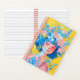 A notebook with a girl with a wreath of blue flowers on her head. The character is a cute girl with flowers on a yellow background in bright shades in watercolor style. A beautiful souvenir for study or work.