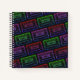 A black spiral notebook, with neon multicolor cassette pattern. Includes audio cassettes with pink, blue, red and green colours on the black background