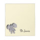 Baby elephant with big ears and fuzzy topknot sits on a pale yellow background. Black shadow, black eyes, and white toenails. Personalise with Name. Hand felted toy created by Debbie Sue Stinson.