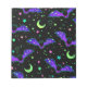 A design featuring purple cartoon bats floating on a black starry background